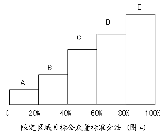 到此为止,必须明确一个模型数值的取值问题。图3中10个要素调查结果的百分数,会在坐标图上显示出由10个点联成的一条曲线,也就必然出现3种不同的变量值:中位值、均值和众值。在此我们以每20个百分点为1个档次,对组织的认知度进行衡量是重点采用均值。因为,在统计学上,均值(X=∑Xi/N)是总体各单位的一般水平的综合指标,主要反映综合数量特征的典型水平,常运用于多项指标的综合分析上。5个档次即2:认知度非常高、1:认知度较高、0:一般、-1:认知度较低、-2:认知度非常低。 为了更实际的反映出组织及其交换物(产品或服务)被社会公众接受的实际广度和认知的实际数量。我们又专门设计出一个“限定区域目标公众量标准分法”,见图4。