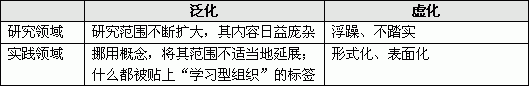我从1996年开始研究学习型组织,一直坚信学习型组织的魅力,因为她的核心宗旨是如何让组织中的成员活出生命的意义,让整个组织不断适应环境的变化而永葆青春。这是多么令人神往的一件事情,也是企业管理界不断追求的理想境界。但在现实生活中,企业“短寿”的现象比比皆是。因此,“学习型组织”理论一经出现,就马上受到理论界和企业界的推崇。事实上,自1990年代以来,世界上很多优秀的企业,如通用电气、壳牌石油、摩托罗拉、AT&T等,都争相成为学习型组织的典范。 在我国,自2000年5月江泽民主席在亚太人力资源峰会上提出“创建学习型社会”的号召以来,全国各地掀起了一股创建学习型组织的热潮,涌现出了“学习型企业”、“学习型社区”、“学习型家庭”、“学习型城市”、“学习型政府机关”、“学习型政党”……等,一时间颇有“乱花渐欲迷人眼”的繁荣景象。 但是,在一派“大好”形势之下,我认为在当前学习型组织研究与实践中出现了“泛化”和“虚化”两种倾向(如下表所示),换句话说,学习型组织在中国开始“泛虚”。这对于学习型组织的健康发展非常不利。