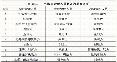 3、主要职能的开发 1)管理人员能力的培养 (1)各阶层管理人员必备的素质 图表三 各阶层管理人员必备的重要资质
