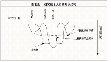 (3)专门职(技术专才)职能的开发 a)专门知识与广博知识 图表五 研究技术人员的知识结构