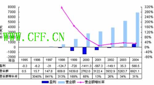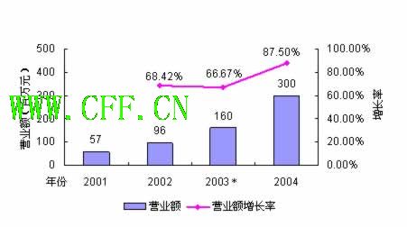 注:2004年亚马逊财务报表 2003年公司首次实现收支平衡 卓越网“精品”模式的成长之路 在融资方面,从创立到被亚马逊收购之间卓越网总共进行了三次融资。2000年由联想和金山共同出资2000万元建立了卓越网。2001年初,公司获得了来自港台机构和个人的投资2500万元。第三次融资发生在2003年,也就是卓越网实现赢利的那年,老虎科技基金投入了5200万元。 经营上,卓越网一直沿着低价的“精品”模式发展。卓越网开通后第一个大手笔就是以惊人的低价销售图书、音像、软件等产品,这使得卓越网开通一年就取得了娇人的业绩。同时为了保证低价,卓越网还自己定制产品,产销一条龙,增加了可供让利的空间。其提出的“十元正版VCD”销售口号以及仅售2元的价格销售《大话西游》就是典型的例子。其中《大话西游》VCD日销售量超过5000套,总销量超过100000套。同时为了保证低价和送货服务的到位,卓越网一直保持“精品”模式。2000年下半年,卓越网对经营的商品进行了调整,去掉了不畅销的商品,明言“只作大多数人的生意”。曾经一度卓越网的库房面积只是当当网的三分之一;卓越网仅经营几千种商品,而当当网的商品种类早已达到二十万种。 财务方面,从图1可以看到卓越网历年的经营状况。卓越网年营业额由成立后第二年的5700万元增长到2004的近3亿元,年增长率保持在65%以上,并于创业后的第四年,也就是2003年开始赢利。 图2 卓越网历年营业情况