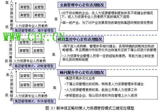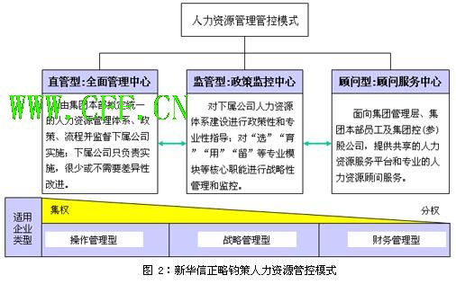 首先,人力资源的定位与集团实行何种管控模式密切相关。按照集分权程度的大小,集团公司的管控模式分为财务管控型、战略管控型和操作管控型三种基本模式。财务管控模式主要针对投资的科学性、风险性和投资回报进行管理,对所投资企业的具体业务一般不进行直接管理,属于分权型安排,在人力资源管理上主要对外派高管、财务总监具有任免考核权;战略管控模式并不要求总部设立具体的业务管理部门,公司总部承担战略规划、监控与服务职能,其考核与管理重点一般也集中于下属公司的董事会或总经理,属于集分权结合型安排;操作管控模式要求总部设立具体的业务管理部门来对下属公司的相关业务进行对口管理,对控股下属公司的营销、技术、人力资源、新业务开发等日常经营运作归口总部相关业务部门进行直接管理,强调公司经营行为的统一,集团总部制定统一的人力资源政策与管理制度,并在下属企业贯彻实施。由此可以看出,与集团管控模式相对应,越是集权的集团管控模式,人力资源管理的权限也越集中于集团总部。 其次,人力资源管理的定位要适应企业人力资源管理体系的完善程度。根据我们的咨询实践,人力资源管理与开发在我国相当企业中还处于起步阶段,人力资源工作尚处于人事管理向人力资源管理工作过渡阶段,绝大多数工作还停留在人事管理阶段,人力资源管理各核心模块的体系、流程尚需进一步完善。显然对这样的集团化企业,在管理制度和体系不很健全的情况下,对于新建的子公司在一定阶段采用集权程度高的人力资源管理职能定位,能够快速形成集团化的、统一的、规范化的制度和流程,沟通协调成本低,政策得到有效贯彻和实施,资源整合程度高。而对于进入成熟期、人力资源管理体系相对健全,具有一定的自身管理能力,并且需要对市场变化做出快速反应的下属企业,宜采用相对分权的人力资源职能定位。 第三,人力资源管理的定位与人力资源专业人员整体素质状况密切相关。这涉及不同层级的人力资源管理素质,包括集团总部的人力资源管理人员的专业素质和下属企业的人力资源管理人员专业素质。采取集权程度高的职能定位,如果集团总部人力资源管理人员专业素质不到位,很难有效对下属企业进行指导和管理,弊端大于益处;如果下属企业人力资源管理人员专业水平低,没有能力制定差异化政策,如果采取放权程度高的人力资源职能定位,势必造成下属企业在低端人力资源管理水平上徘徊,影响集团化企业的整体效益回报。特别需要注意的一个现象是,在集团母子公司的分权管控模式下,下属各企业独立意识浓厚,在某种程度上不希望集团进行人力资源管控,如果没有组织制度和信息反馈机制保证,集团总部很难获得信息,人力资源的整体战略很难有效的向下贯彻实施,在一定程度上造成“政出多门”和资源浪费的现象。因此,具体采取何种人力资源的职能定位,需要考虑企业不同层级的人力资源管理专业素质,而采取有针对性的人力资源职能定位。 二、集团人力资源管理的功能定位和管控模式设计。根据新华信正略钧策多年管理咨询实践总结,集团化公司有三种人力资源职能定位:直管型、监管型和顾问型,相应的有三种管理模式,即全面管理中心、政策管理中心和顾问服务中心。(见图 2) 直管型的全面管理中心模式属于集权程度高的管理模式,由集团本部拟定统一的人力资源管理体系、政策、流程并监督下属公司实施,下属企业只负责实施,很少或不需要差异性改进;顾问型的顾问服务中心模式属于分权型管理模式,面向集团管理层、集团本部员工及集团参/控股公司,提供共享的人力资源服务平台和专业的人力资源顾问服务;监控型的政策管理中心属于集分权结合模式,对下属企业人力资源体系建设进行政策性和专业性指导,对“选”、“育”、“用”、“留”等专业模块的核心职能进行战略性管理和监控。