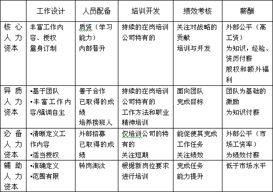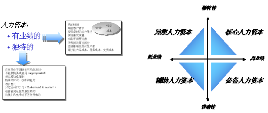 一、 根据绩效考核的结果和岗位的可替代性对员工采取分层分类的人力资源管理策略。 人力资源工作要抓重点,在绩效考核结果的应用上也是如此。首先我们通过绩效考核找出优秀的员工和差的员工,并根据人力资源或知识和技能的可替代性将这些员工分为核心人力资本、异质人力资本、必备人力资本和辅助人力资本四大类。根据每一类别的特点采取不同的人力资源策略。 核心人力资本:高业绩、高独特性 异质人力资本:低业绩、高独特性 必备人力资本:高业绩、低独特性 辅助人力资本:低业绩、低独特性 分层分类的人力资源策略: