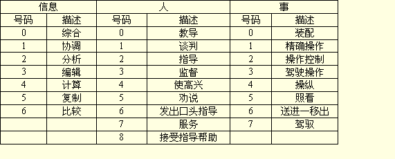 美国劳工部提出一种成为工作者功能的职务分析(Functional Job Analysis)作为职务分析程序的一个阶段。工作者功能是指那些确定工作者与信息、人和事之间关系的活动。这些活动如下表: