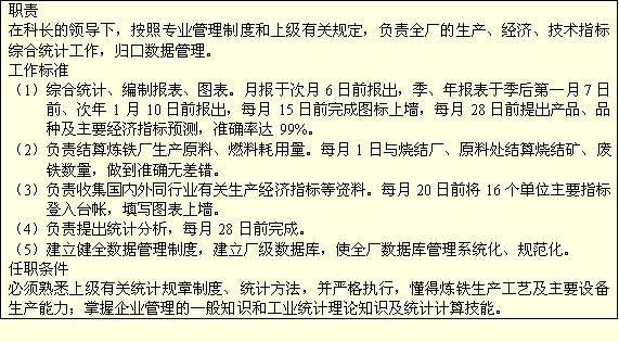 为了降低工作分析的成本,应当尽量利用现有的资料,以便对每个工作的任务、责任、权利、工作负荷、任职资格等有一个大致的了解,为进一步调查奠定基础。 岗位责任制是国内企业特别是大中型企业十分重视的一项制度。但是,岗位责任制只规定了工作的责任和任务,没有规定该工作的其他要求,如工作的社会条件、物理环境、聘用条件、工作流程以及任职条件等等,如果根据各企业的具体情况,对岗位责任制添加一些必要的内容,则可形成一份完整的工作描述和任职说明书。下表是一份较为完善的岗位责任制,对工作分析有较大的参考价值。 某炼钢厂计划科综合统计员的岗位经济责任制