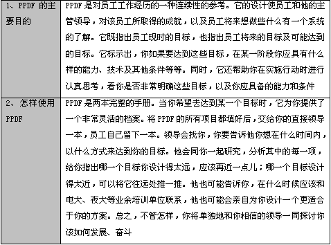 2、职业生涯发展文件(PPDF) PPDF(Personal Performance Development File)就是个人职业发展档案,它是一种极为有效的职业生涯匹配人力资源开发的方法。 2.1PPDF的使用指南